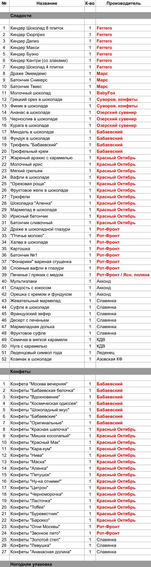 Конфеты "Огни Москвы" (1 шт), Конфеты "Звонкое лето" (1 шт), Драже в шоколадной глазури (1 шт), "Птичье молоко" (1 шт), Халва в шоколаде (1 шт), Картошка (1 шт), Батончик №1 (1 шт), "Фонарики" вареная сгущенка (1 шт), Слоеные вафли в глазури (1 шт), Печенье / пряник с медом (1 шт)